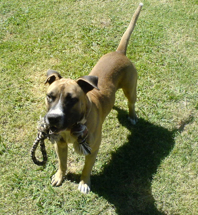 Here is a picture of our new dog Odo. He is a Pitbull-ish pup, probably about four months old judging from his almost full-grown muscular body but puppy-like behavior.
